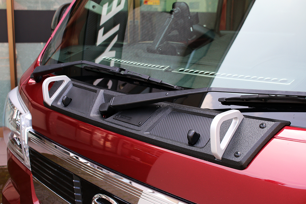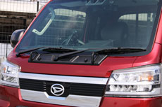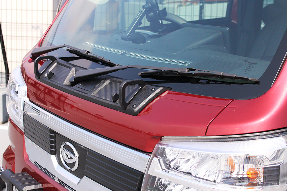ボンネット上部&ワイパーベース部に貼り付けるだけで、無機質なボンネットがゴツカッコイイビジュアルにカスタムアップできるガーニッシュです。不愛想な働く車が見違えるカスタムアップできるクールアイテムです
