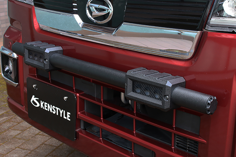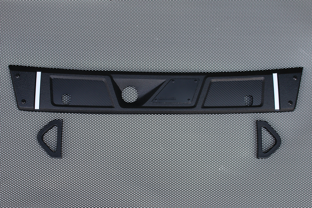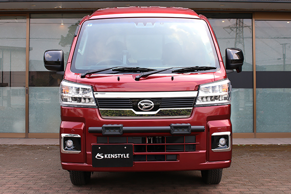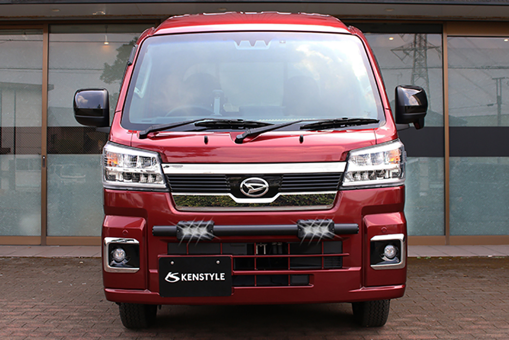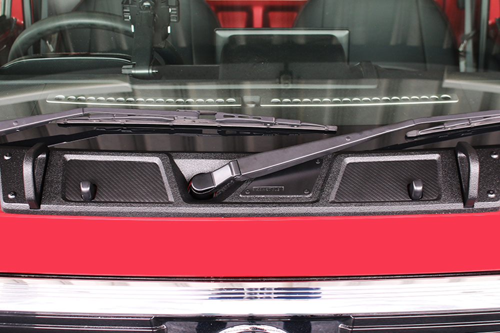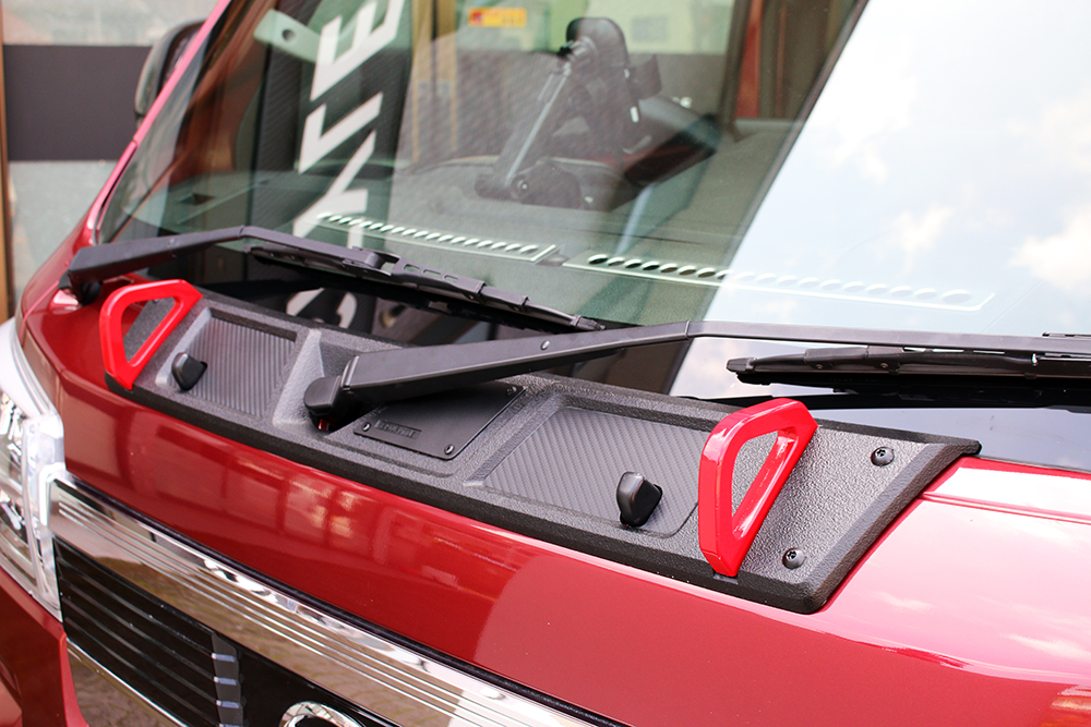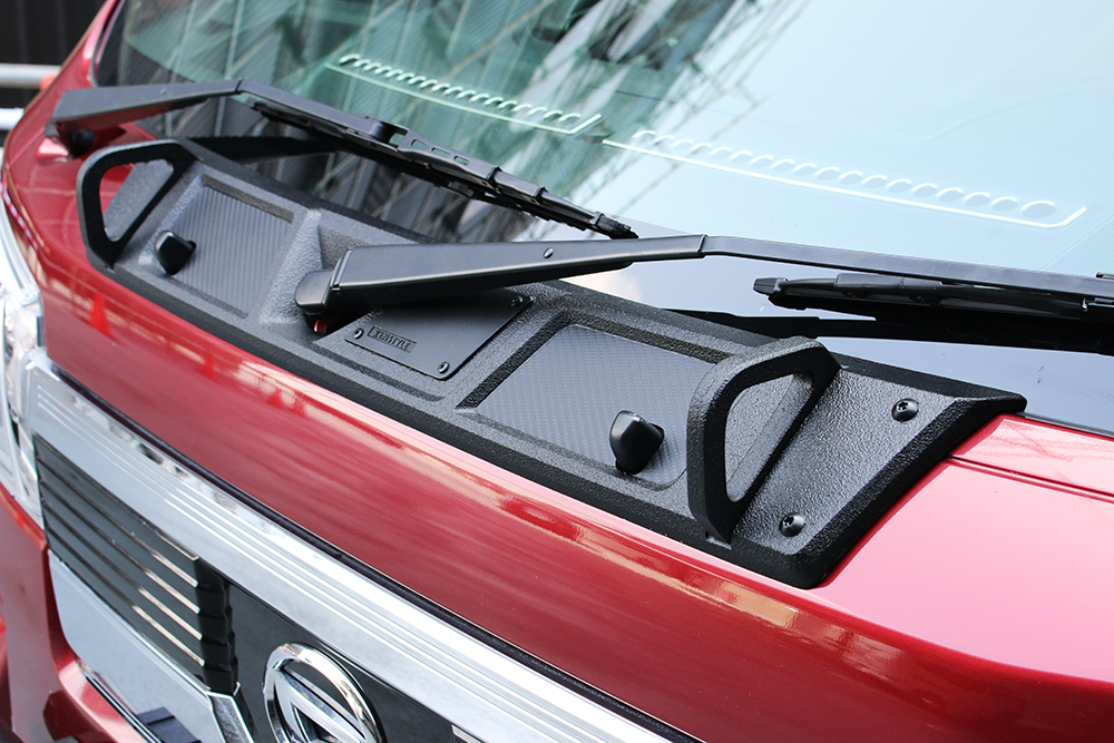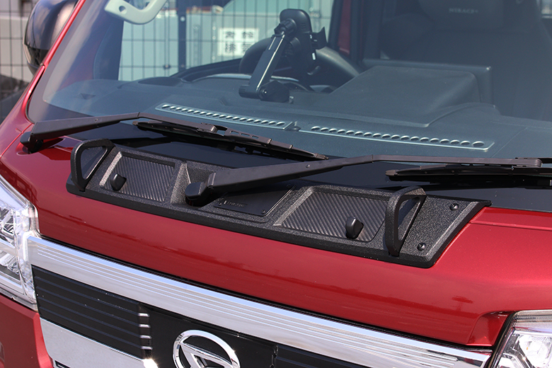 ボンネット上部&ワイパーベース部に貼り付けるだけで、無機質なボンネットがゴツカッコイイビジュアルにカスタムアップできるガーニッシュです。不愛想な働く車が見違えるカスタムアップできるクールアイテムです